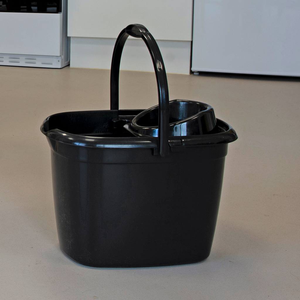 The Recycled Great British bucket is made in the UK from 70% recycled plastic waste. It features a black, solid compact design, wringer with high neck sieve, handle, mop holder and overspill holes. This recycled bucket is only available in black.