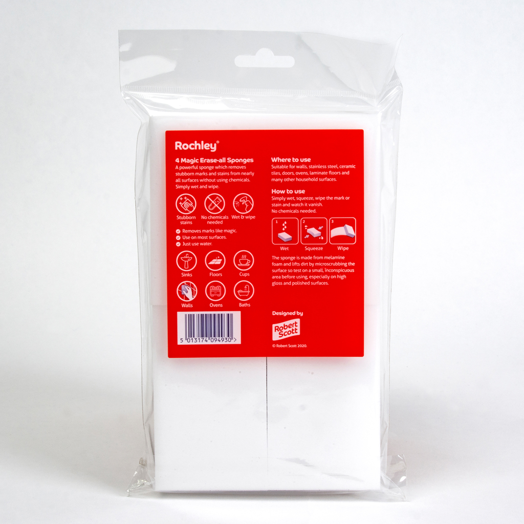 A powerful sponge which removes stubborn marks and stains from nearly all surfaces without using chemicals.