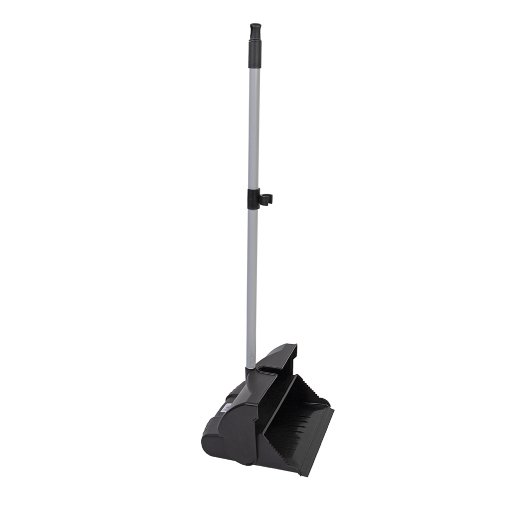 Dustpan has a rubber lip to keep it flush to the floor and swing-up action to collect debris efficiently.