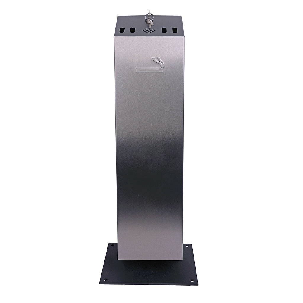 Free Standing Stainless Steel Ashtray is weather resistant and suitable for use in outdoor smoking areas. Designed to quickly extinguish cigarette butts, with a weighted base which can be fixed to the ground for extra security. Lift-out container for fast, easy emptying. Lockable (keys supplied).