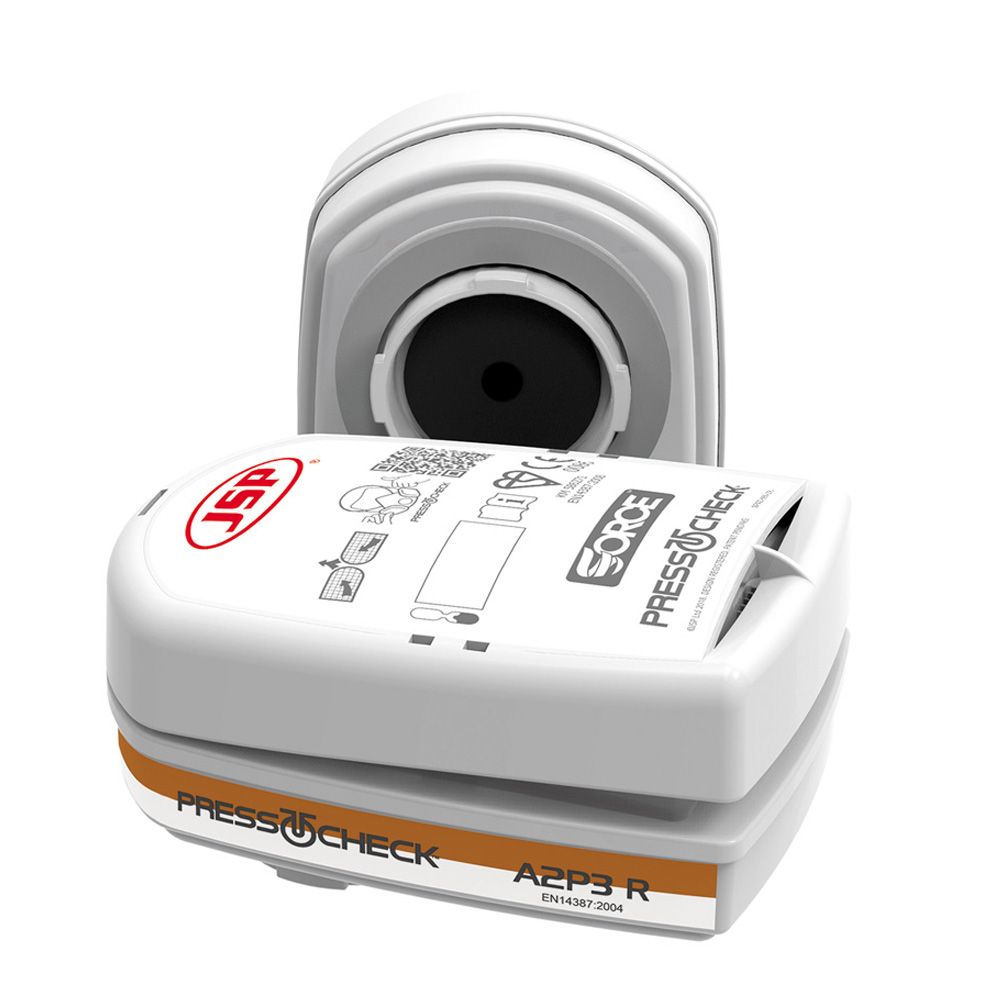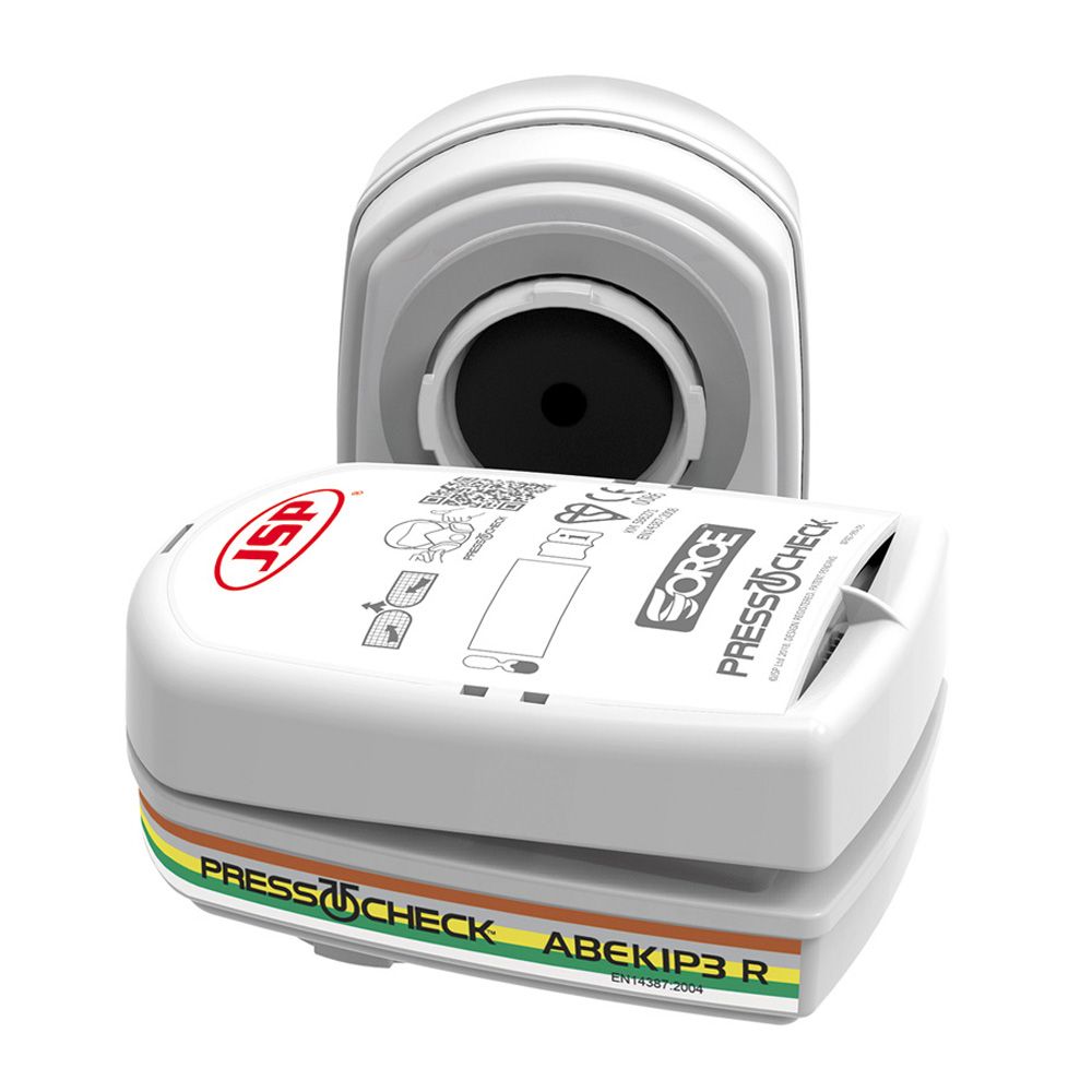 JSP® Force™ 8 PressToCheck™ Filters allow you to make sure that you have the correct seal on your respirator at all times. If no air comes through the mask when squeezing the front and back of the filter-corners – you can be sure you have the perfect seal! These filters offer premium protection against a range of gases, vapours and airborne particulates.