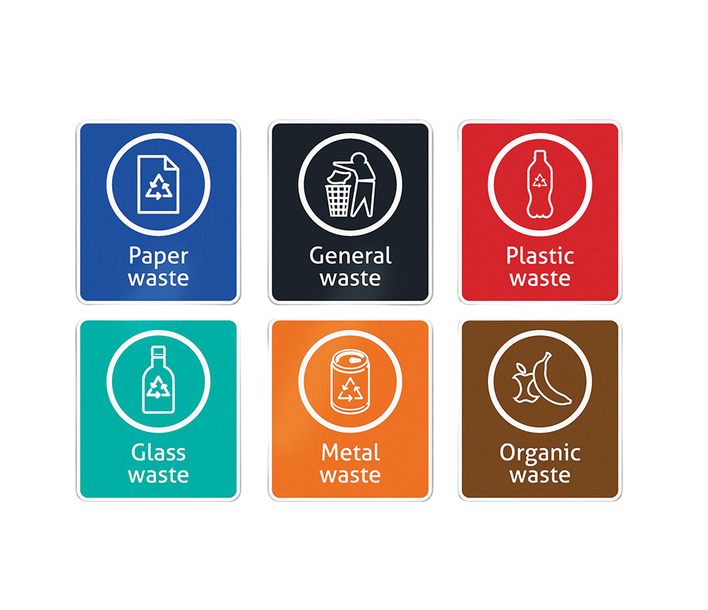 Sheet of six self-adhesive recycle labels to apply to a variety of recycle bins to aid the segregation of waste.