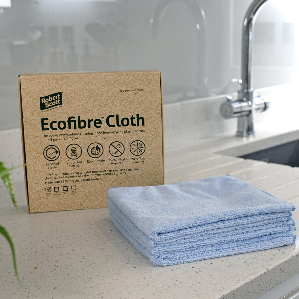 Robert Scott Ecofibre Microfibre Cloth has the cleaning power of microfibre with 55% of each cloth made from recycled plastic bottles, there are 2 recycled bottles in each cloth.