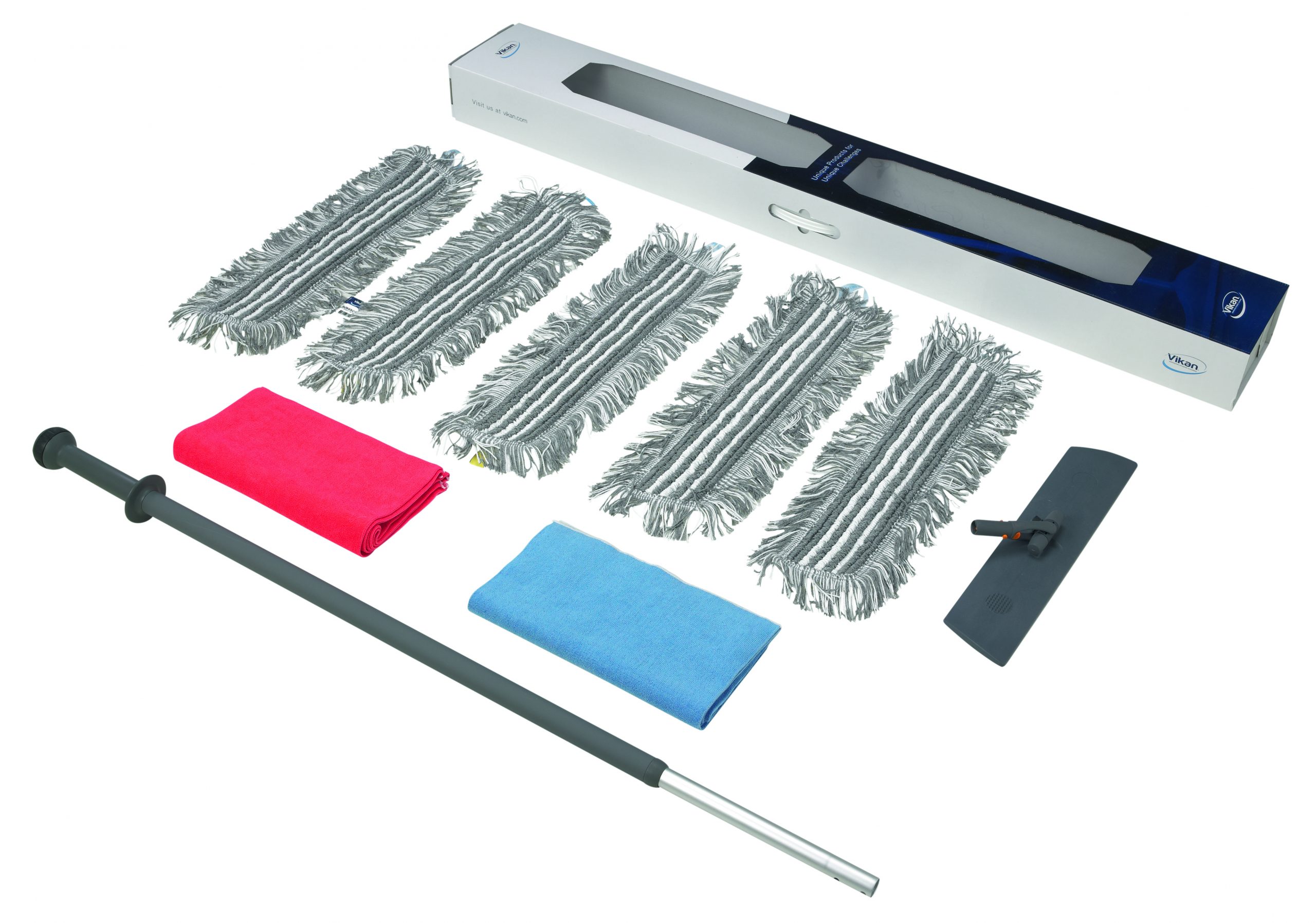 Vikan Starter Kit Microfibre includes 1 telescopic handle, 1 composite mop frame, 5 microfibre mops, 2 X 5 original microfibre cloths 5 in red & 5 in blue.